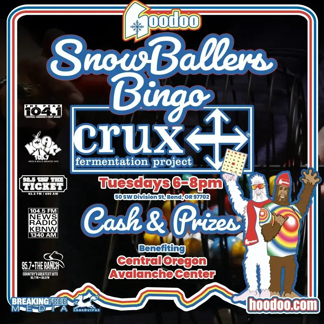 Join us every Tuesday from 6 PM to 8 PM at Crux Fermentation Project for Hoodoo's Snowballers Bingo! Enjoy an evening of fun and win some bling, all while supporting the Central Oregon Avalanche Center (COAC). COAC